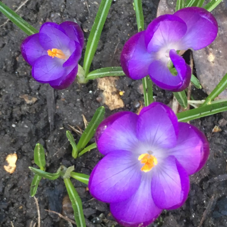 Clearing up the leaves and opening up the soil, worms squirming. Bright purple crocuses raising their heads up into the bright day.