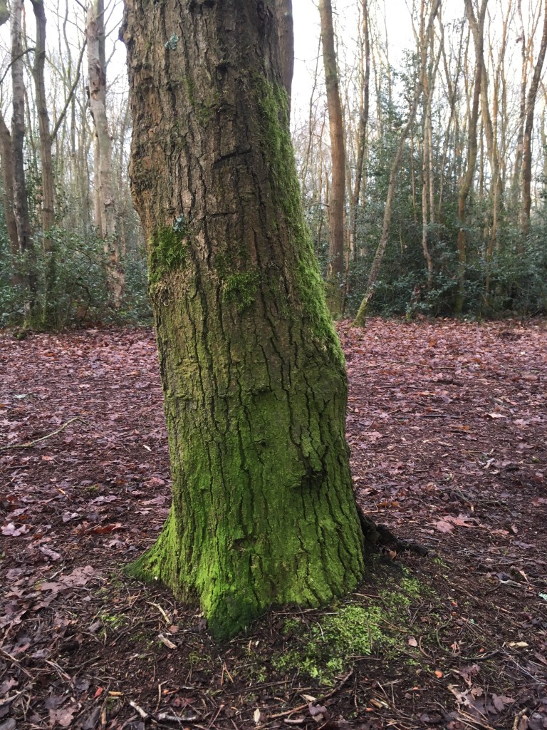 It’s a grey brown dawn with a nip in the air and a milky sky. The only vivid colour is the lustrous green of the moss hugging the tree trunks.